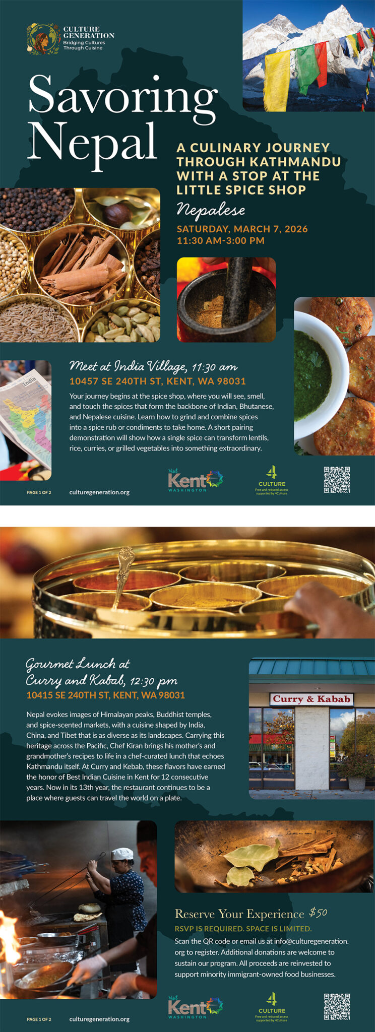 “I am excited to introduce you to Taste of Kent/Taste of Community, a project I hold close to my heart – which allows me to share with you the immigrant ethnic markets, bakeries, local spice shops and mom and pop restaurants in Kent, Washington.”