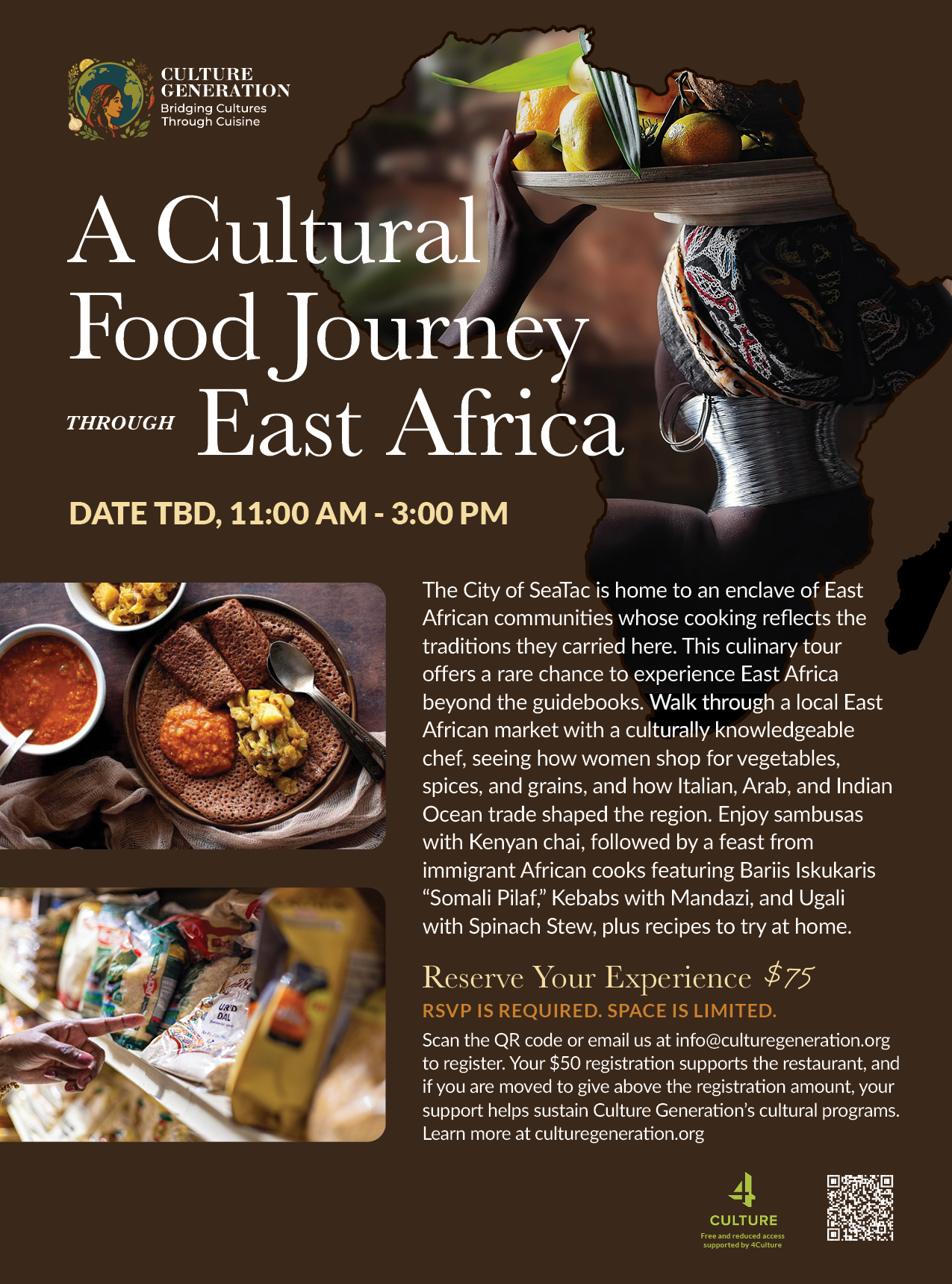 The City of SeaTac is home to an enclave of East African communities whose cooking reflects the traditions they carried here. This culinary tour offers a rare chance to experience East Africa beyond the guidebooks. Walk aisle by aisle through a local East African market with a culturally knowledgeable chef, seeing how women shop for vegetables, spices, and grains, and how Italian, Arab, and Indian Ocean trade shaped the region. Enjoy sambusas with Kenyan chai, followed by a feast from immigrant African cooks featuring Bariis Iskukaris “Somali Pilaf,” Kebabs with Mandazi, and Ugali with Spinach Stew, plus recipes to try at home.